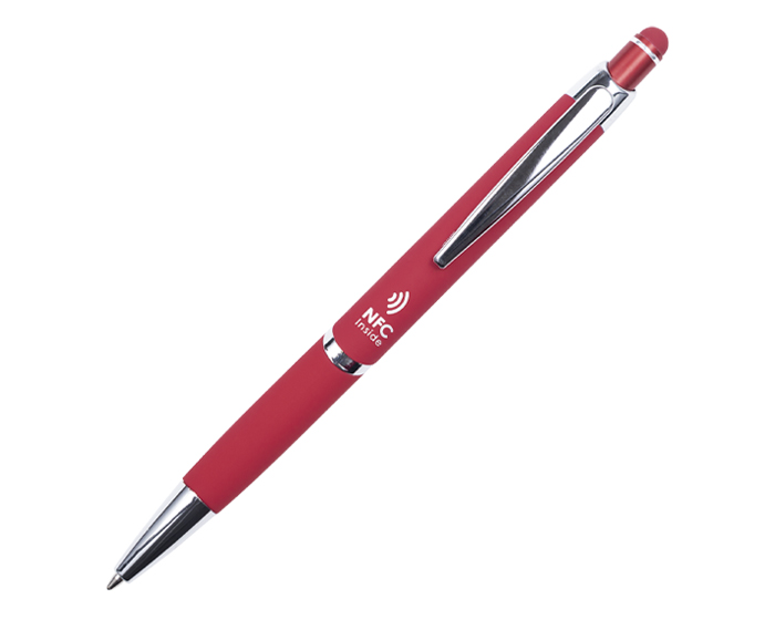 Bolígrafo de aluminio con acabado de goma suave al tacto y detalles en cromo. Cuenta con touch screen en la parte superior del color del bolígrafo y mecanismo de click. Al grabar destapa en color plata. Repuesto en tinta negra alemana de 1 mm. Tiene una etiqueta NFC en su interior que enlaza la información rápidamente a la aplicación de NFC, compatible con todos los celulares Android e iOS que cuenten con esta aplicación disponible.