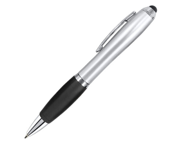 Bolígrafo de plástico en color plata, con punta touch para pantallas táctiles . Mecanismo retráctil.